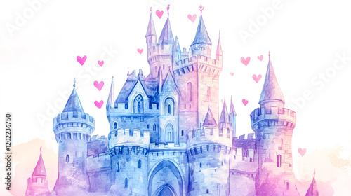 Intricately hand-drawn watercolor illustration of a majestic medieval castle at dawn, adorned with heart-shaped banners, evoking an emotional and serene mood