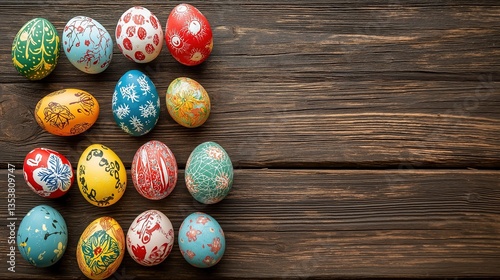 Intricately Patterned Easter Eggs Arrayed on Dark Wooden Plank Background with Ample Copy Space for Custom Text and Graphic Design Layout in Festive Spring Celebration Concept