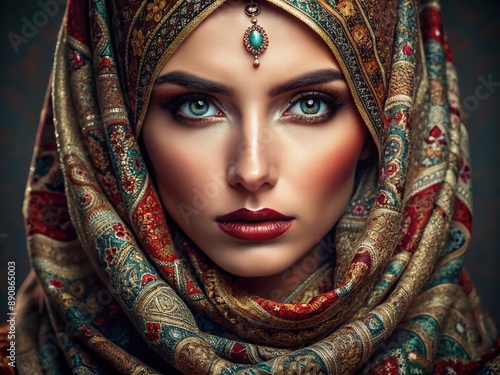Intricately patterned headscarf enfolds a striking woman's face, her piercing eyes radiating intensity, surrounded by subtle skin tones and delicate facial features in a cultural masterpiece.
