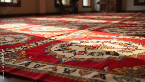 prayer, rug, texture, intricate, spirituality, culture, tradition, design, fabric, warmth, red, gold, pattern, lighting, detail, ritual, artistry, craftsmanship, room, no people, spiritual, serene, calmness, decorative, indoor, ambience, peaceful, heritage, faith, elegance, furniture, shadow, soft, textile, traditional, geometric, home, environment, sacred, design, beauty, decor, relaxation, 1