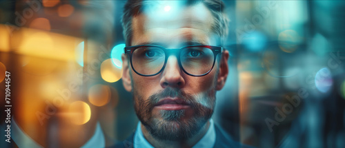 business, technology, man, portrait, digital, city, light, office, professional, gaze, suit, goggles, expression, thoughtfulness, urban, bokeh, blue, evening, closeup, adult, contemplation, modern, corporate, executive, intelligence, strategy, career, future, sharpened, depth, eyewear, fashion, style, innovation, ambition, leadership, determination, serious, young, caucasian, businessman, face, guy, photogenic, eyeglass