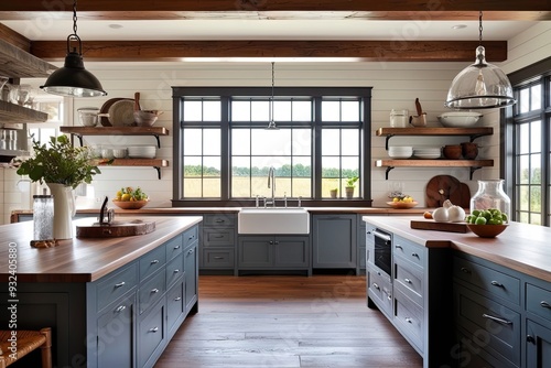 Inviting Farmhouse Kitchen Design Featuring Large Island Rustic Shelving and Expansive Windows