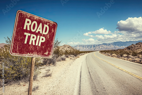 Inviting sign with text "ROAD TRIP" sign points along an endless highway stretching into the desert horizon, beckoning travelers to an adventurous journey ahead