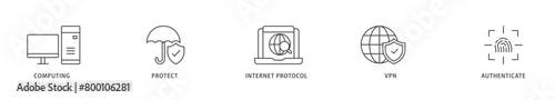 IPsec icons set collection illustration of cloud computing, protect, internet protocol, vpn, and authenticate icon live stroke and easy to edit