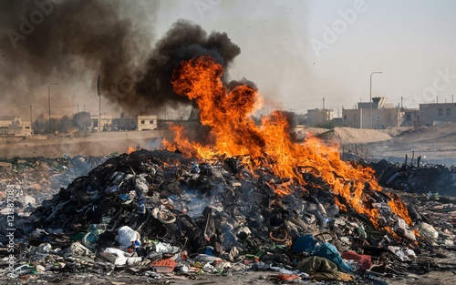 Iraq air pollution, Burning garbage pile emitting thick black smoke near buildings.