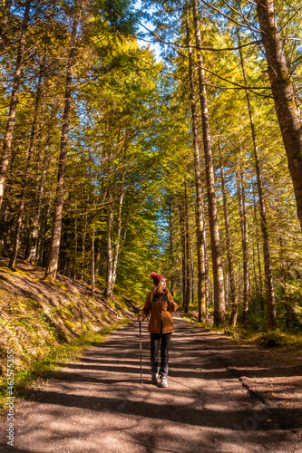 Irati forest or jungle in autumn, a young woman on the trail of the Irati houses. Ochagavia, northern Navarra in Spain