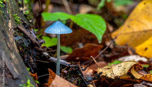 Iridescent blue mushroom growing on forest floor among fallen leaves