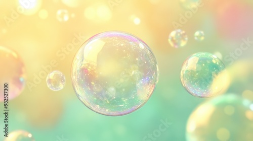 Iridescent bubbles drifting on a pastel mint and yellow background.