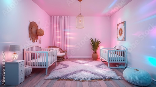 Iridescent colors, long exposure 3D render of a Boho nursery featuring pastel colors, rattan furniture, plush rugs, capturing motion and light trails, iridescent reflections