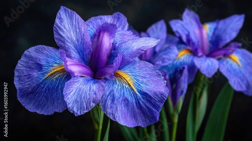 Iris fade with mood and movement concept. Stunning purple flowers bloom vibrantly against a dark background.
