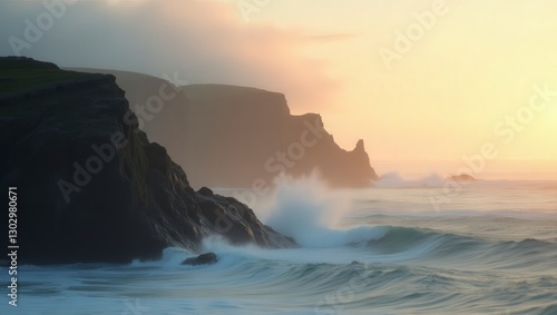 ireland, coast, cliff, ocean, sea, wave, sunset, landscape, seascape, rocky, shore, atlantic, irish, travel, tour tourism, nature, scenery, dusk, dawn, coastal, island, water, rock, terrain, sunlight, sky, evening, morning, vacation, get-away, splashing, spray, foam, surge, breaking, turquoise, horizon, isle, cliff, headland, headland, bluff, stone, golden hour