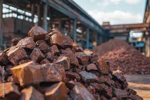 Iron ore rocks are piled up near a steel manufacturing facility, showcasing an industrial environment with heavy machinery and equipment in the background under a clear sky