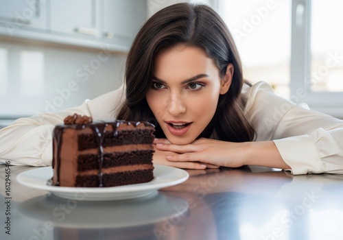 Irresistible Glance: A beautiful woman gazes at a delicious slice of chocolate cake on a bright kitchen counter. Capturing a moment of temptation and indulgence.