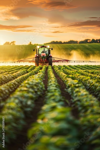 irrigation tractor spraying or harvesting agricultural crop at sunset. photo is real. place for text. information infographic, generative ai