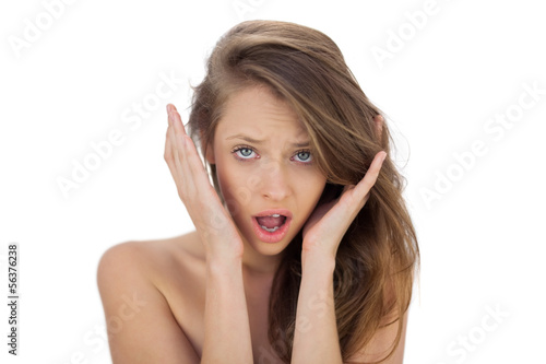 young adult, woman, female, caucasian, white background, natural, long hair, brown hair, brunette, beautiful, beauty, pretty, attractive, cute, gorgeous, purity, clean, pure, fresh, youthful, posing, feminine, femininity, naked, naked, bare, shoulder, shouting, screaming, yelling, hand, gesticulate, amazement, surprising, surprised, shocked, astonished, portrait, cut-out, isolated
