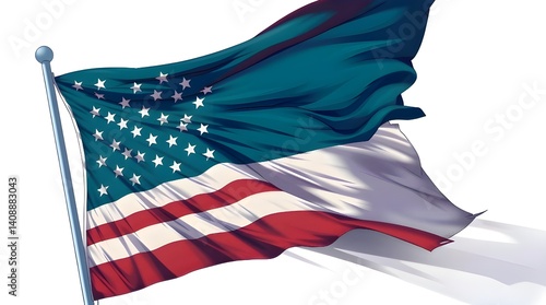 Isekai anime style illustration of an American flag on a white background, rich deep teal colors, expressive composition, luxurious and vibrant aesthetic, suitable for advertisements or text overlays