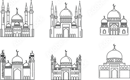 Islamic Mosque Icon Set with Elegant Line Art Style Domes and Minarets for Ramadan Kareem, Eid Al Fitr, and Religious Greeting Card Designs