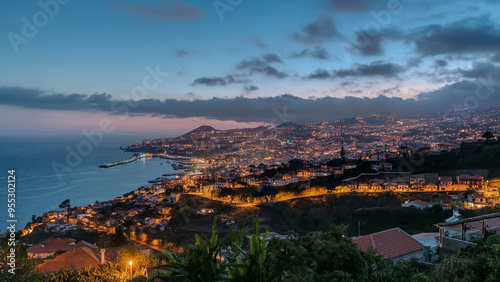 Island landscape after sunset panoramic view to Funchal, Madeira, Portugal timelapse