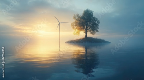 wind, turbine, tree, island, water, sky, cloud, sunrise, sunset, nature, energy, renewable, clean, future, environment, technology, sustainable, landscape, serene, calm, peaceful, mist, fog, morning, evening, dusk, dawn, horizon, light, sun, gold, blue, green, ecology, conservation, preservation, resource, earth, planet, climate, change, power, generation, innovation, infrastructure, alternative, development, progress