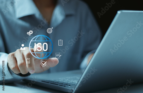 ISO Certification concept. Quality assurance, compliance, global standards, and International organization. Person using laptop with ISO icon on virtual screen.