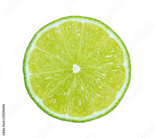 Isolate cross section green lime, a close up photo image of a cross slice green lime isolate on bright white back ground present a detail of surface pattern and texture on cross section of green lime