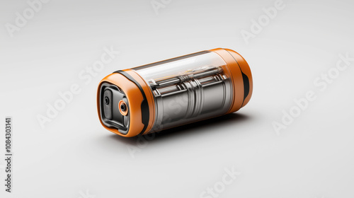 Isolated 3D of an orange and gray transparent mechanical component with intricate internal wiring and gear details on a neutral background.