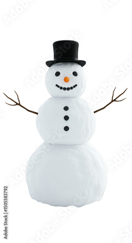 isolated, snowman, snow, winter, cold, season, white, black, hat, cheerful, festive, holiday, decoration, celebration, fun, happy, smile, cute, cartoon, character, frost, glacé, weather, christmas, new year, background, transparent, three-dimensional, illustration, object, design, art, graphic, nature, outside, funny, smiling, silk hat, buttons, carrot, branch, eye, mouth, simple, element, shape, render, digital