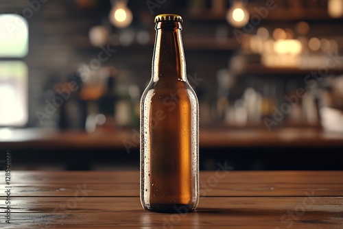 Isolated amber beer bottle covered in condensation on a rustic wooden bar top : Generative AI