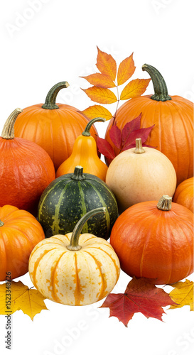 Isolated Assorted Pumpkins and Colorful Leaves Transparent Background