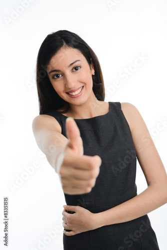 business, woman, cheerful, thumb up, thumb, executive, successful, winner, professional, entrepreneur, suit, confident, standing, manager, modern, office, achievement, black, secretary, gorgeous, portrait, white, girl, female, people, happy, beautiful, person, young, businesswoman, brunette, lifestyle, attractive, isolated on white, ethnic, arab, middle east, indian, latin, hispanic, pretty, smile, corporate, looking, working, positive, casual attire, elegance, stylish, active