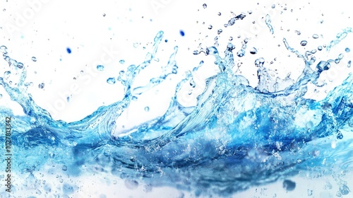 Isolated blue water splash on a white background, capturing the vibrant motion and detailed droplets of the water in action
