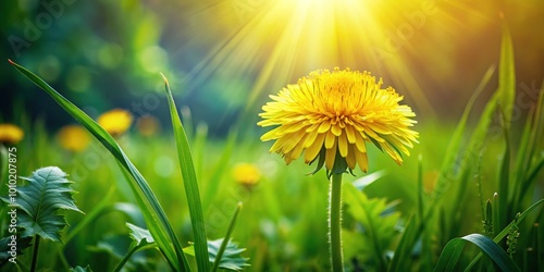 Isolated bright yellow dandelion bloom stands tall amidst lush green blades, symbolizing hope and new beginnings in a serene and peaceful natural rural landscape.