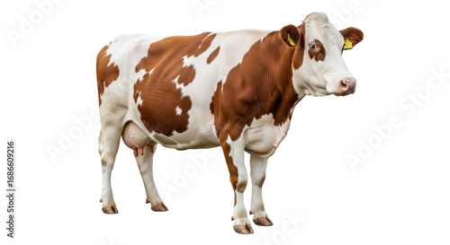 cow, brown, white, cattle, animal, farm, isolated, mammal, farm animal, dairy, agriculture, field, pasture, rural, countryside, nature, grass, domestic, portrait, standing, looking, horn, udder, spot, country, village, rustic