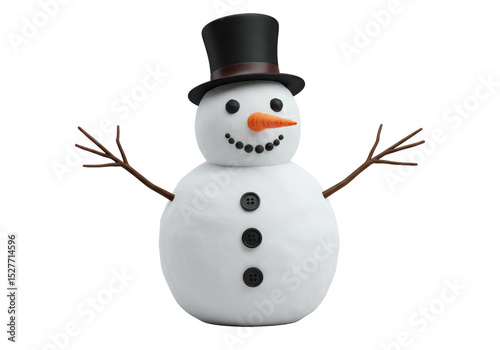 Isolated Cheerful Snowman with Carrot Nose and Black Hat