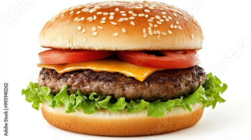 cheeseburger, hamburger, lettuce, tomatoes, bun, white background, food photography, red tomato, juicy