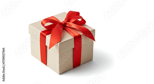 Isolated Christmas gift box mockup on clean white background, wrapped with red ribbon, soft shadows, professional stock photo for advertising and design use.