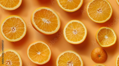 Isolated close-up view of whole and sliced oranges forming a lively pattern, perfectly lit on a bright orange backdrop