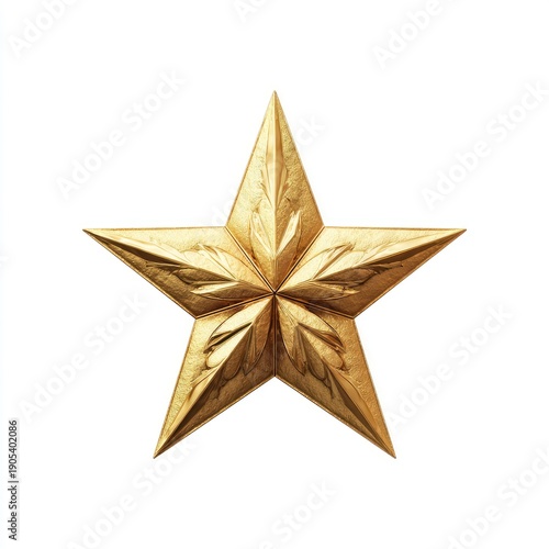 Isolated, detailed, golden five-pointed star with textured surface, on a clean white background