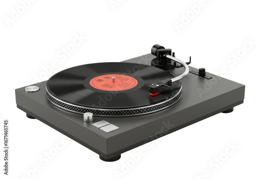 Isolated gray turntable with black vinyl LP playing, retro audio equipment object