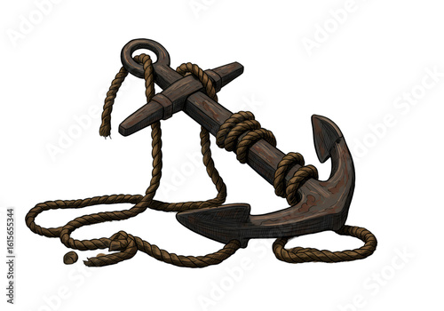 Isolated Illustration Of A Rusty Anchor With Brown Rope On A Black Background