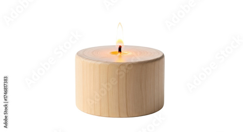 Isolated lighted wooden candle on simple design, perfect for cozy home decor item