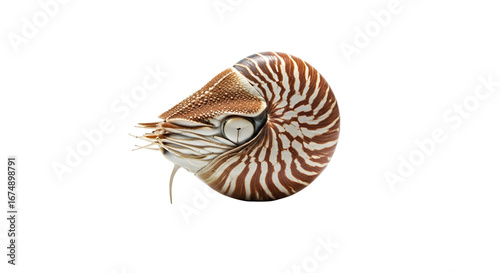Isolated nautilus shell displaying its intricate spiral structure against a stark white backdrop, revealing its natural beauty and design