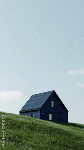 Isolated Nordic-style house in deep blue on a lush hill with a clear sky.