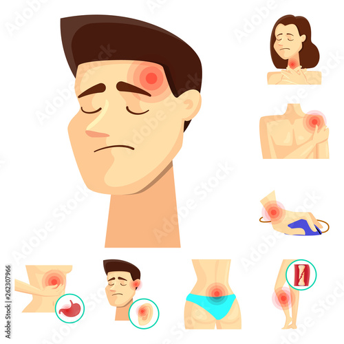 head, throat, shoulder, hand, abdomen, ear, belly, leg, cephalalgia, painfully, bone, wrist, stomach, abdominal pain, knee, stress, inflammation, ravenous, infection, fracture, emotion, neck, muscle, bruised, diarrhea, migraine, pain, disease, suffering, injury, damage, wound, hospital, rendering, first, help, set, vector, icon, illustration, isolated, collection, design, element, graphic, signs, cartoon, colours