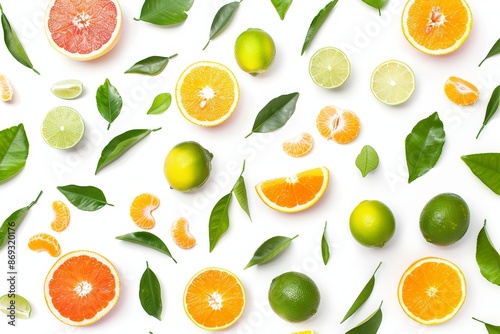 Isolated on a green background are oranges and lemon limes falling in the air with half slices and a background of green leaves, fresh organic fruit that is rich in vitamins and minerals.