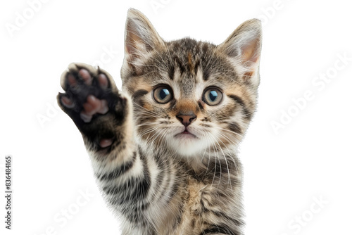 Isolated on white background, a cute kitten with its paw raised, ready to pounce, embodying playful curiosity and energy