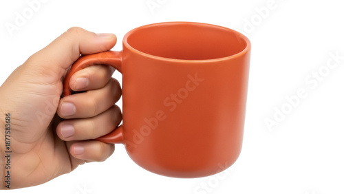 isolated, mug, cup, hot drink, drink, orange, ceramic, beverage, handle, person, holding, container, hand, hot, breakfast, tea, caffeine, kitchen utensile, crockery, object, utensil, coffee mug, closeup, hot drink, tableware, bright, plain, horizontal, studio shot, closeup, hand-held, earthenware, vessel, finger, minimalist