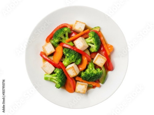 Isolated plate of tofu stir fry with broccoli, carrots, bell pepper and healthy food