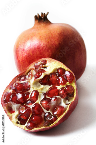 pomegranate, fruit, white background, isolated, ripe, cross section, food, health food, healthy eating, vertical, red, halved, half, cut, cracked, studio shot, seed