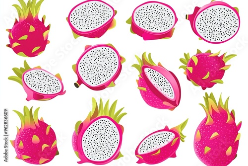 Isolated set of Pitaya. Collection of ripe dragon fruit or pitahaya, half and slice of fruit on white background.